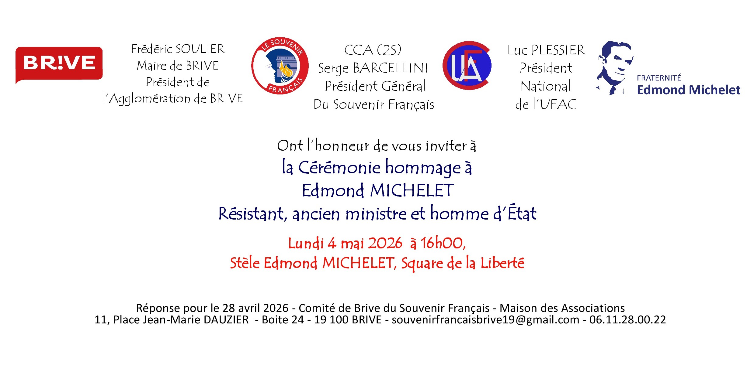 Cérémonie d’hommage devant la stèle Edmond Michelet. Organisé avec la Ville de Brive et la Fraternité Edmond Michelet, cet hommage unira les autorités locales, les représentants des associations d’anciens combattants et les jeunes.